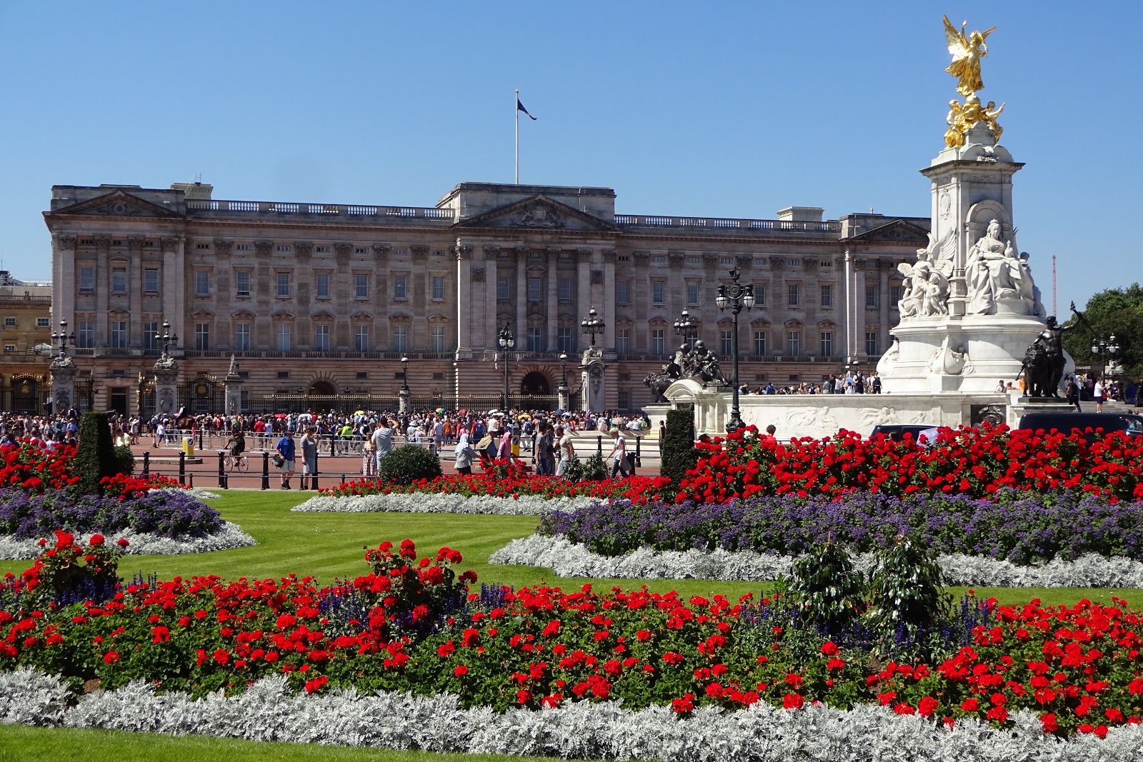 of Buckingham Palace near the statue of Queen Victoria, “billowing on her